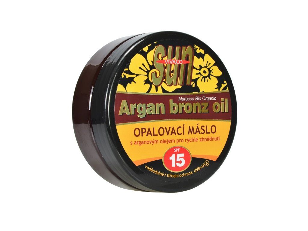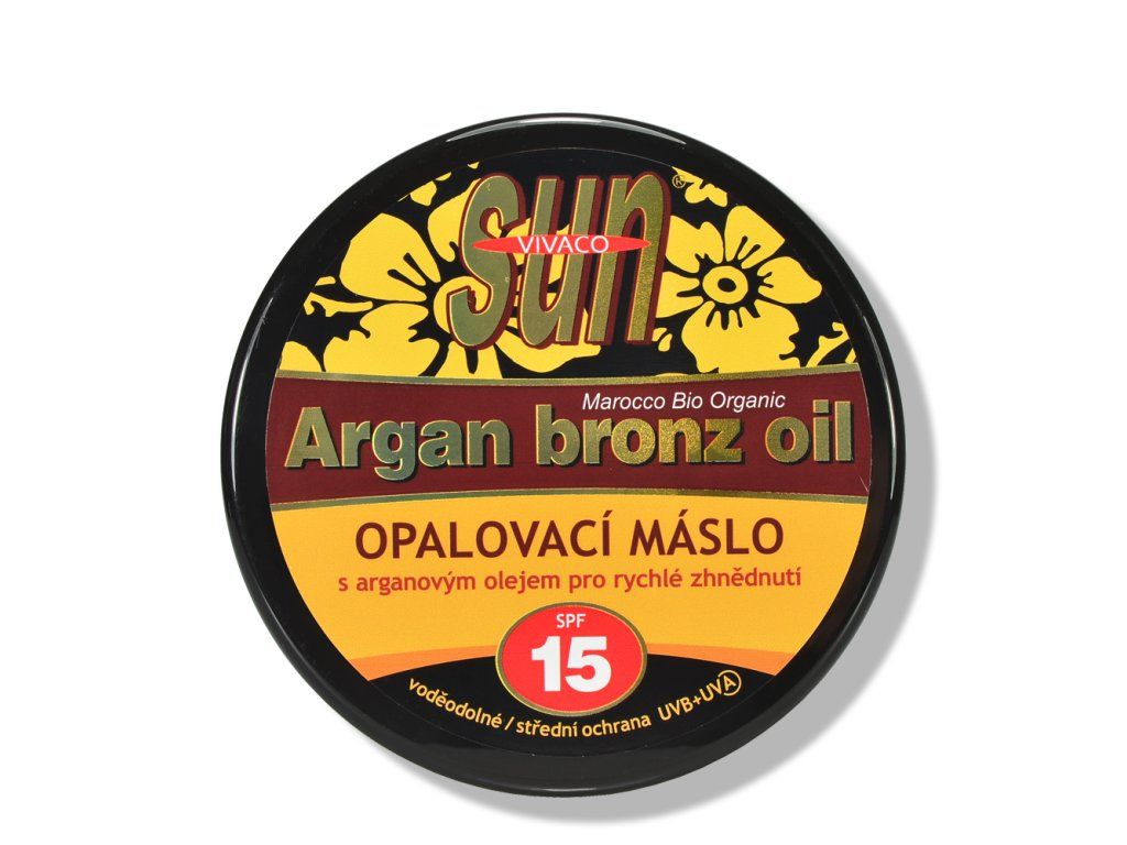 Arganové opalovací máslo Sun Vital SPF 15 je bronzující máslo s nízkou UV ochranou a luxusní péčí o pokožku. Po nanesení se mění v olej a snadno se roztírá.